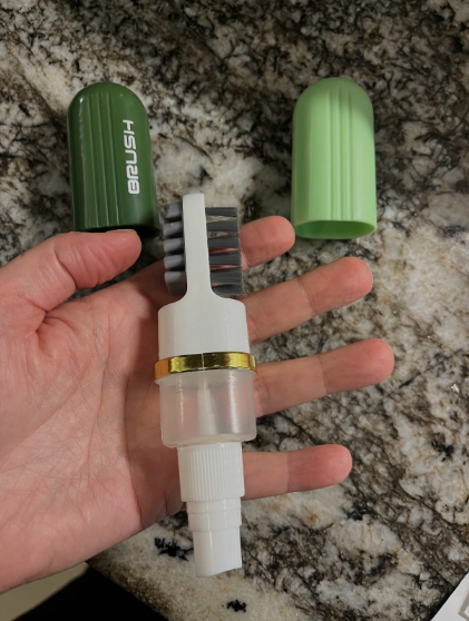 I'm impressed by the convenience of this shoe brush cleaner. Its compact size fits snugly in my hand, although removing and replacing the end caps can be tricky. The spray nozzle works well, and the soft bristle brush effectively removes dirt from tight spots. The 2-sided silicone head is intriguing and gentle on suede, ensuring a uniform appearance. Perfect for quick touch-ups before heading out!